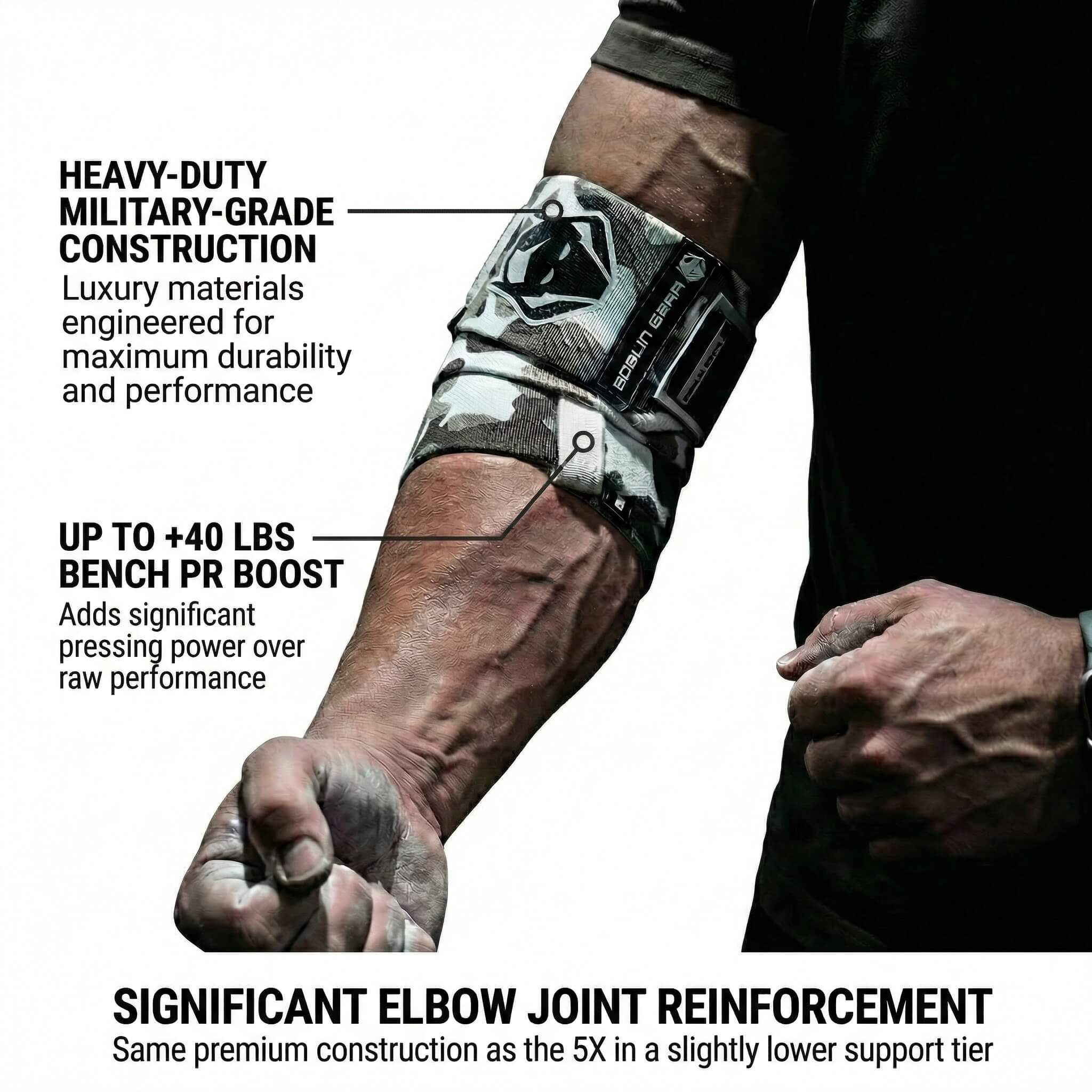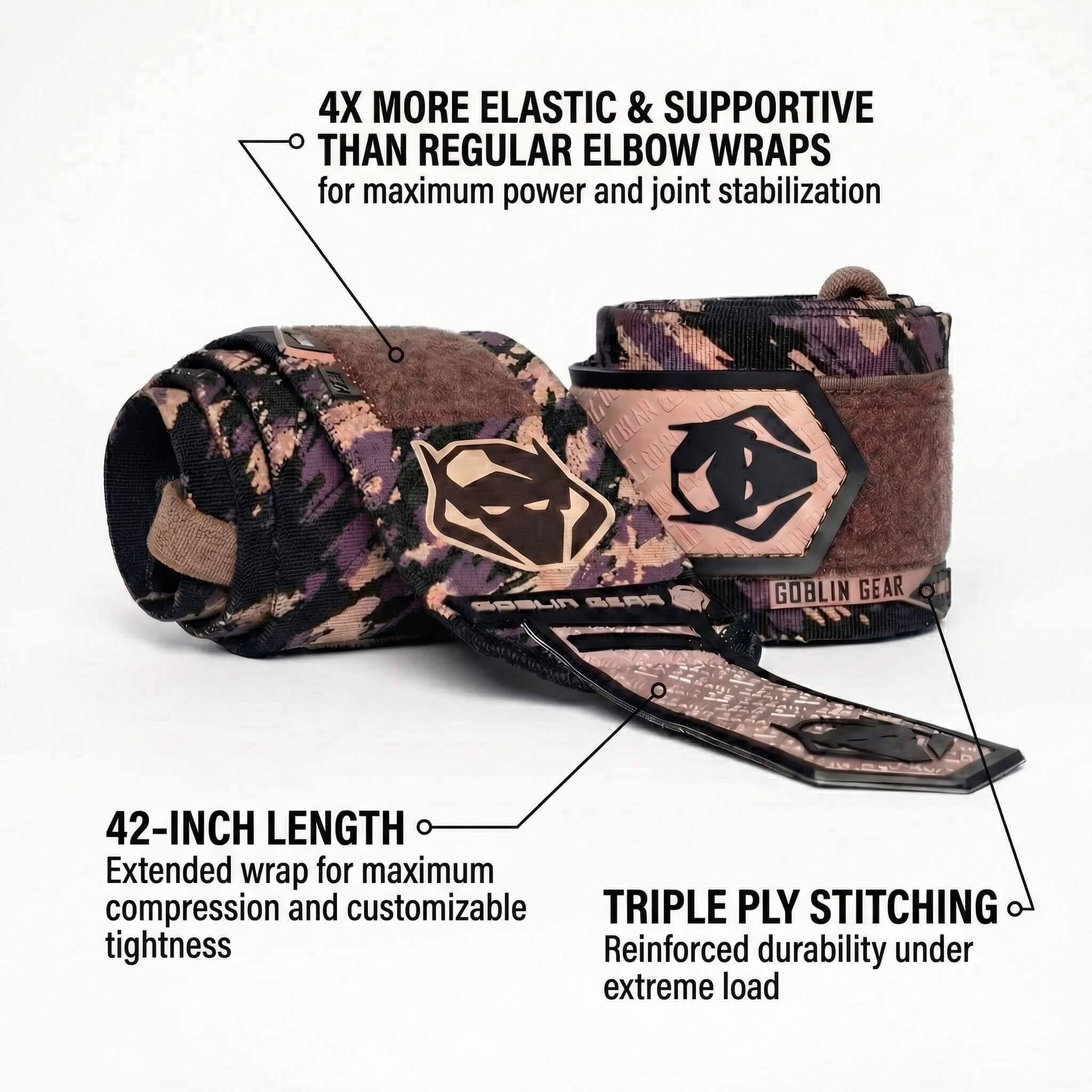- Flawless Designs for Maximum Performance: Goblin Gear's premium Elbow Wraps fuse peak performance with innovative design. The rubber heavy-duty closure, tabs, and accents ensure a secure, customizable fit. Vibrant colors and camo elastic add style. Triple-strength stitching guarantees durability, and heavy-duty velcro ensures unwavering support. Our flexible logo seamlessly stretches with the elastic, creating a perfect blend of style and functionality for flawless performance.
